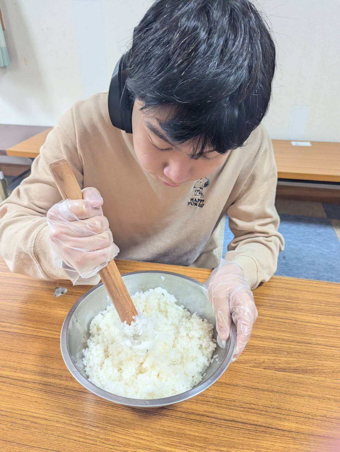みんなに順番にご飯をつぶしてもらい、いい具合になったら手に水をつけてこねこね☺