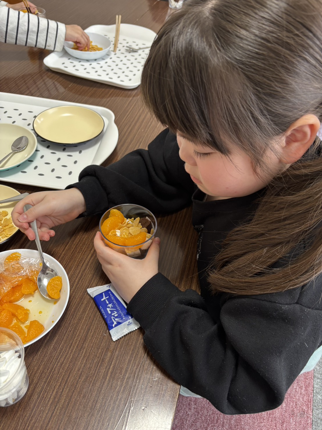 クッキング 2026.03.18 hoopsii 3月14日㈯は、パフェを作りました🍫 みんなずっと楽しみにしていた行事です✌ どんな盛り付けにするか、イメトレをしてきていたお友だちも😊 クリームを絞って好きなトッピングを選んで、自分だけのオリジナルパフェの完成👏 上手に盛り付けができました🍊 お店ででてきそう😊 みんなあっという間に完食しました!!
