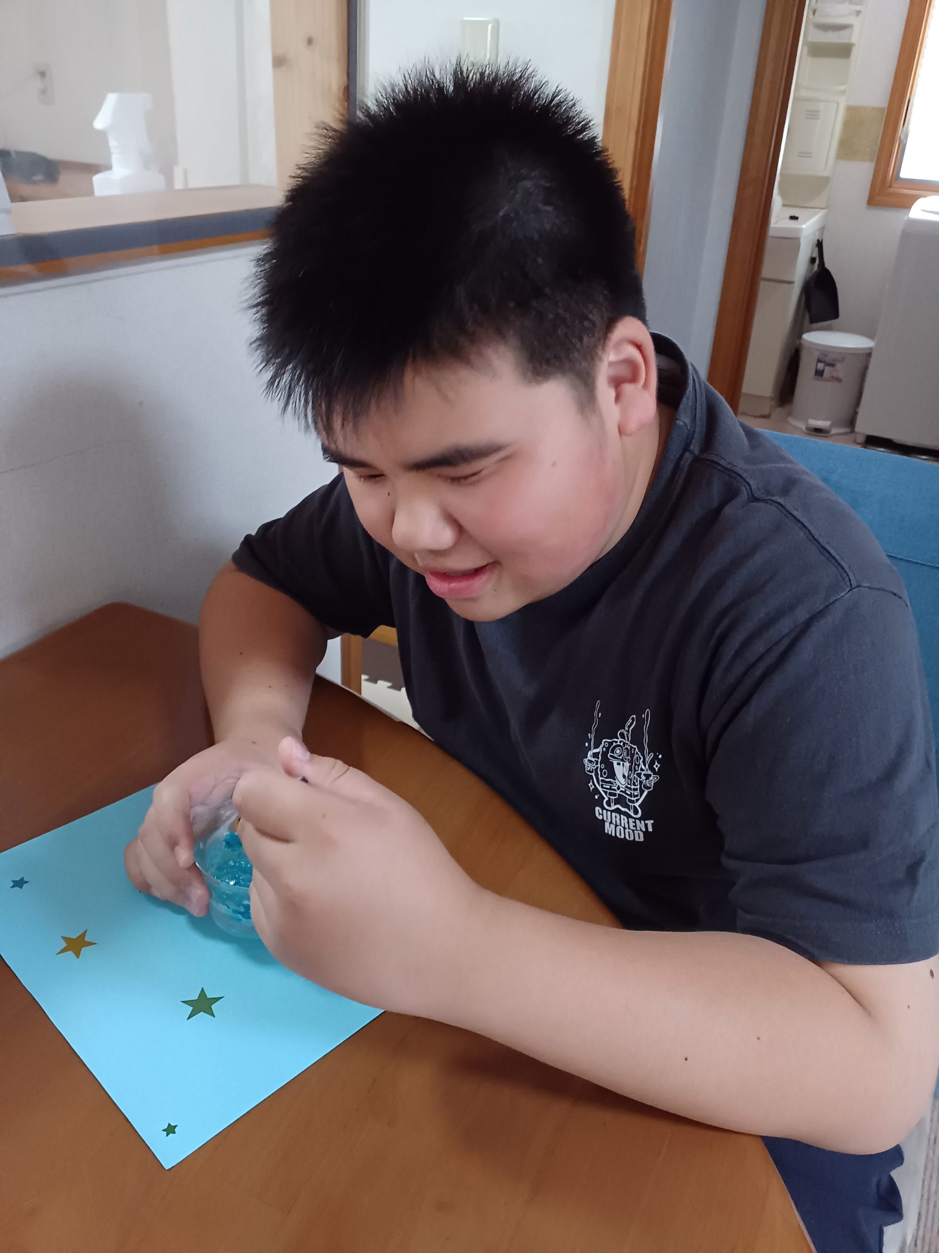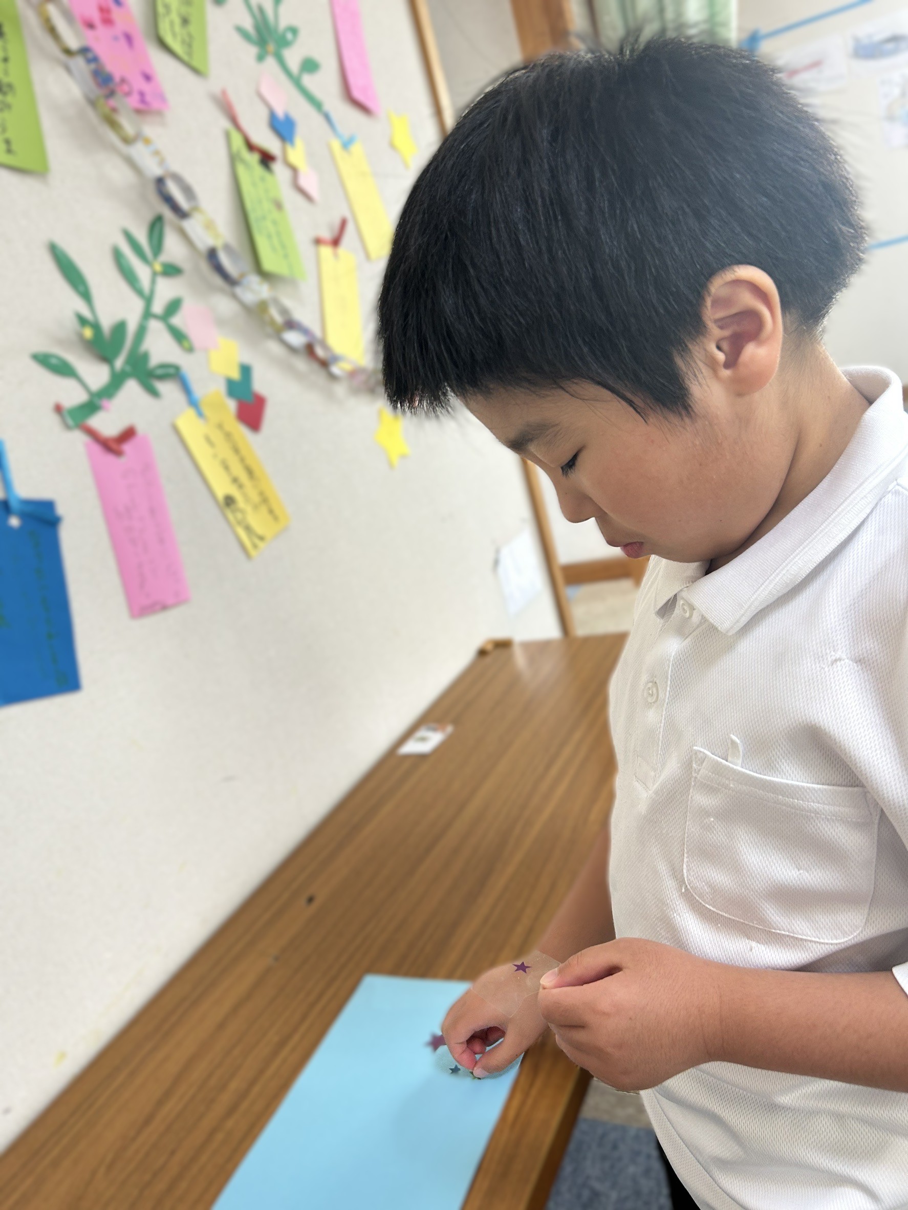 七夕ゼリー🌟 2025.07.09 hoopsii 7月7日 七夕の日のおやつは七夕ゼリーでした🌟 来所後、画用紙に星のシールをぺたぺた… 自分だけのランチョンマットを作り、おやつの際に使用しました♪ 星形のゼリーやきらきらのアラザンがのった七夕ゼリーに嬉しそうな顔を浮かべ、美味しそうに食べていました😋✨