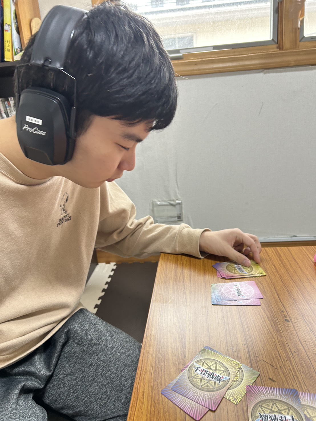 こちらはカードを種類別に仕分けしていきます。カードゲームの種類に分けることはもちろん、そのカードの属性、レアリティなど色々指示を出して分けてもらいました。理解するとものすごいスピードで進めていき、職員もびっくり!