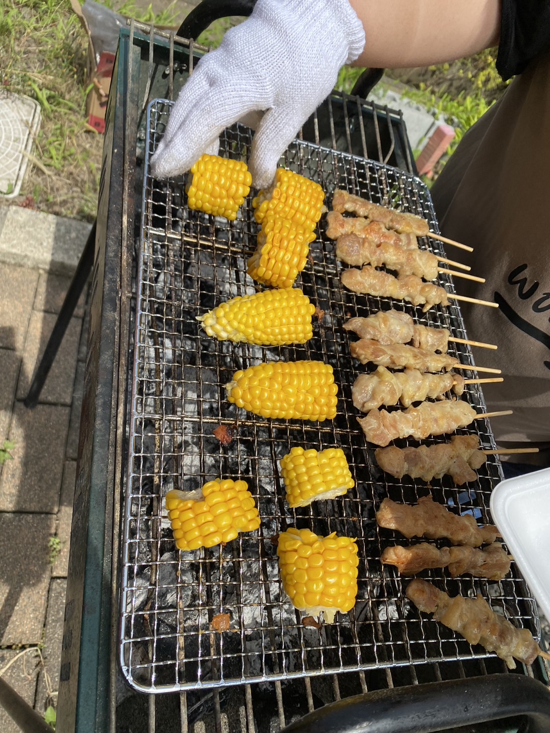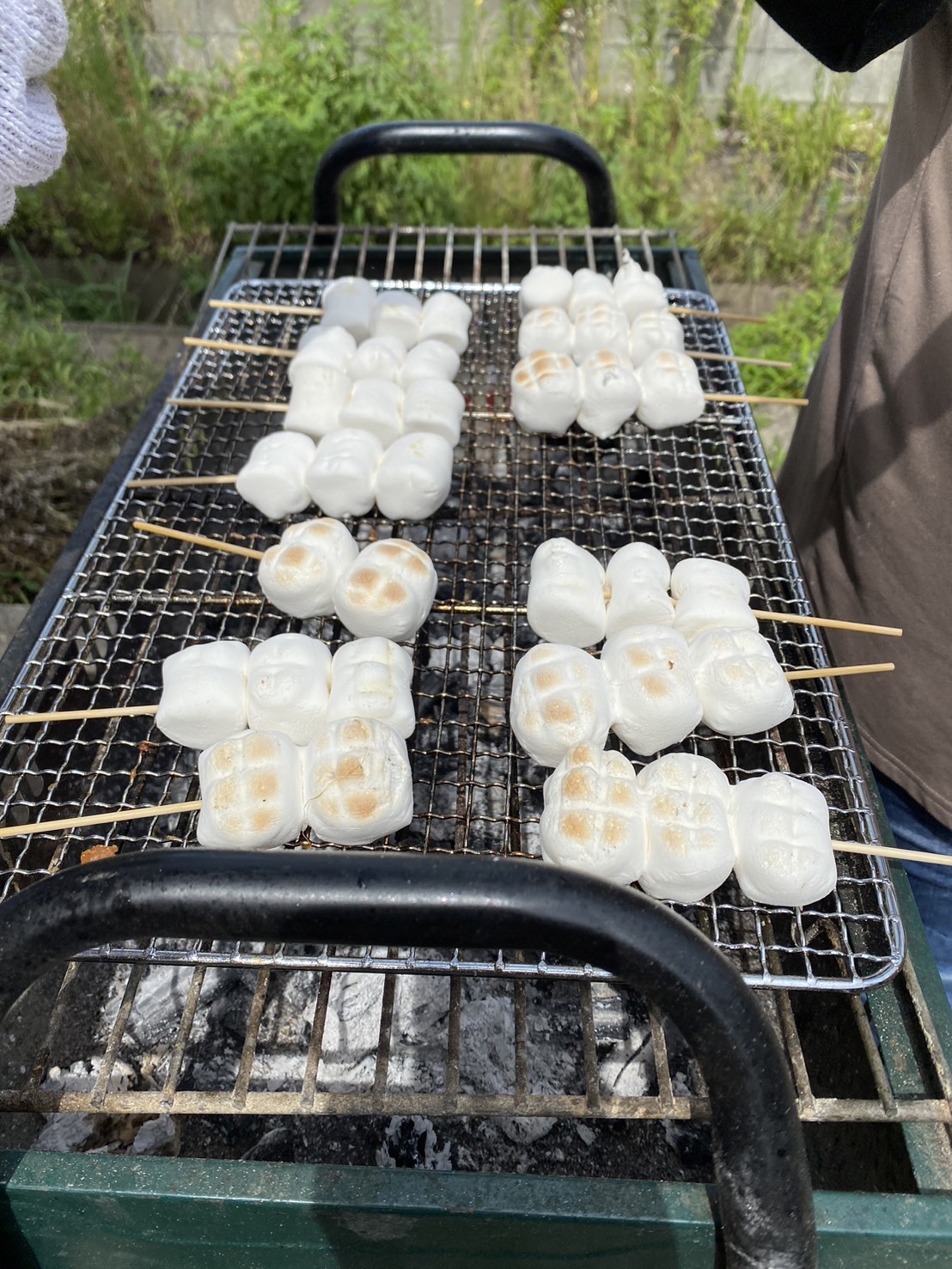 焼き鳥に野菜にマシュマロ…焼きそばにおにぎり、フランクフルトと様々なメニューが並び、楽しそうにしている皆です。